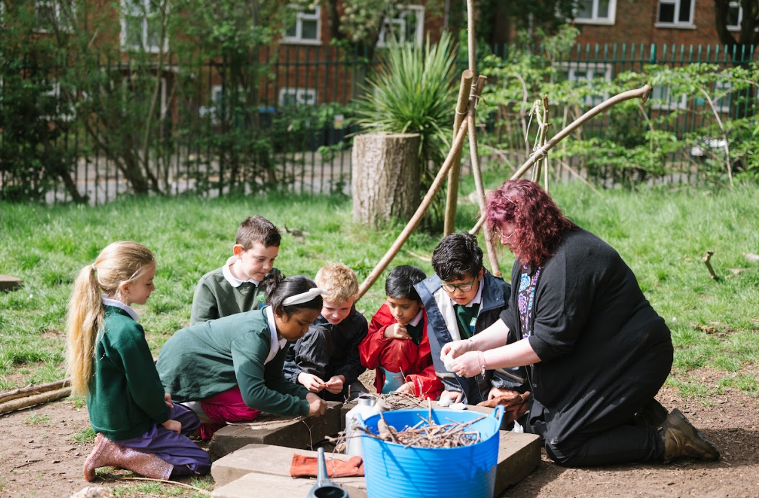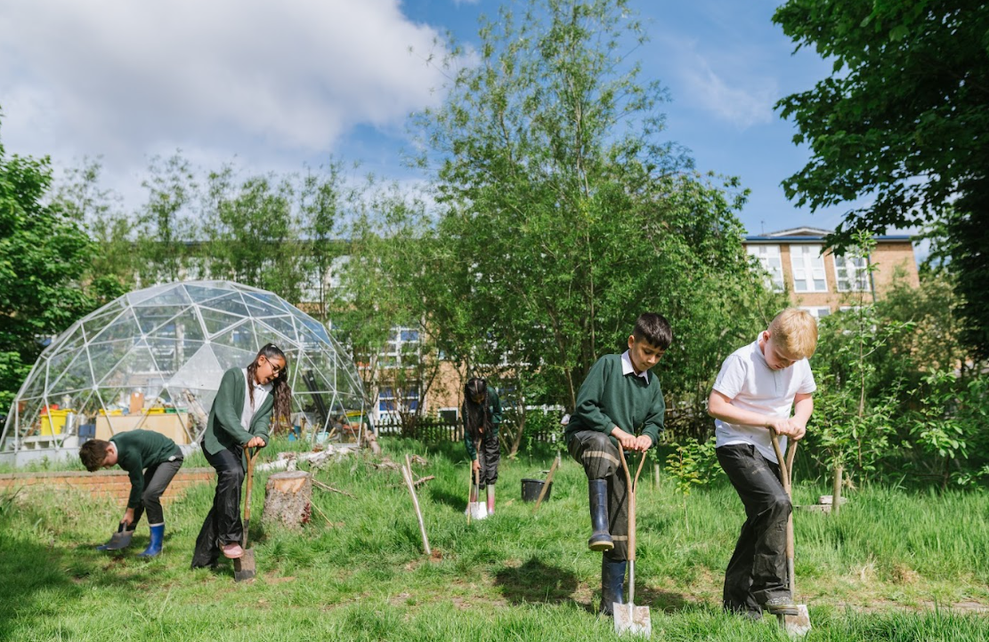At LGJSFS a site is being developed using the perimeter of the school grounds formerly part of the garden area. The base camp is in an area of mature trees and the site includes the solar dome and reuses the former bog garden. Children from gardening club have helped to plant trees from the forestry commission to start the development of the site.